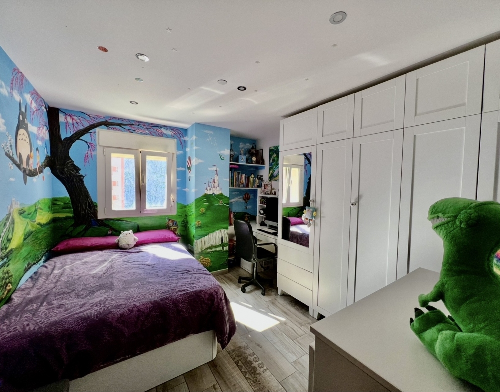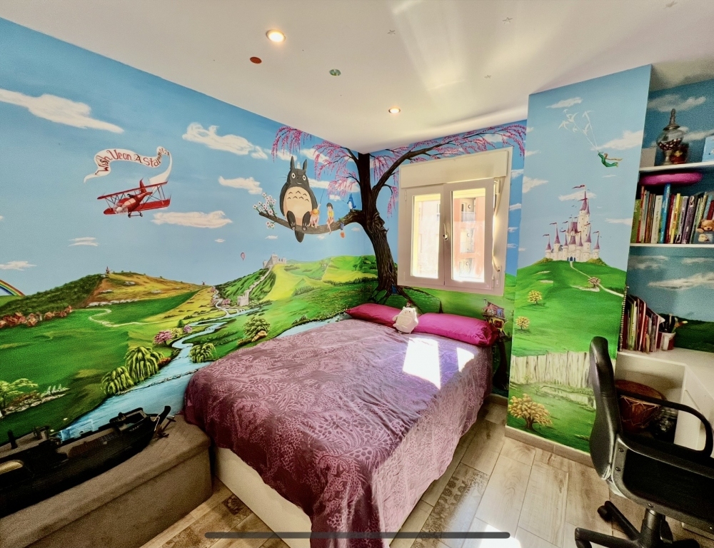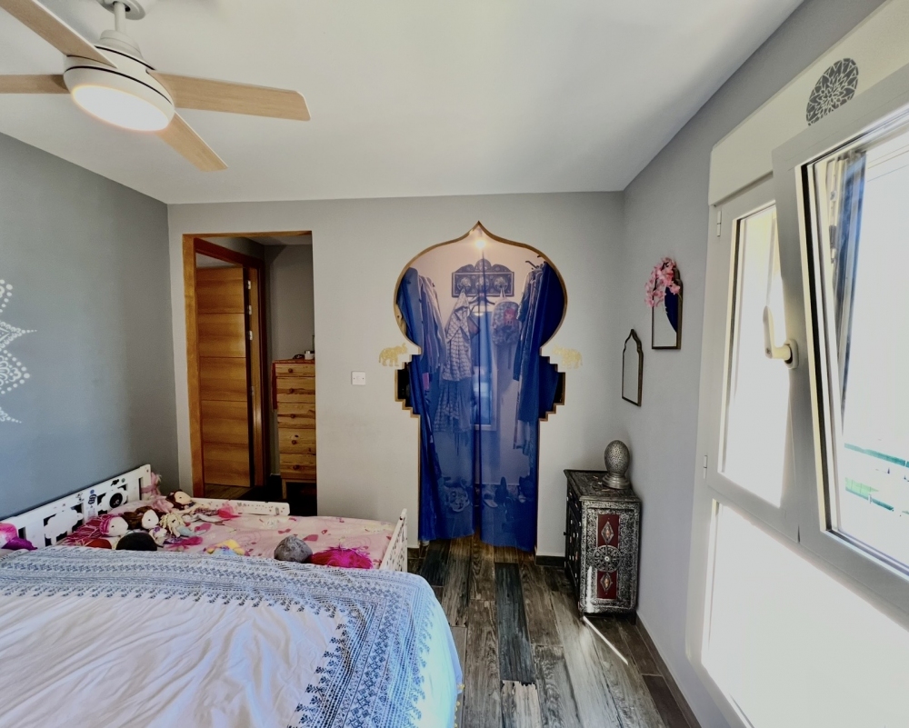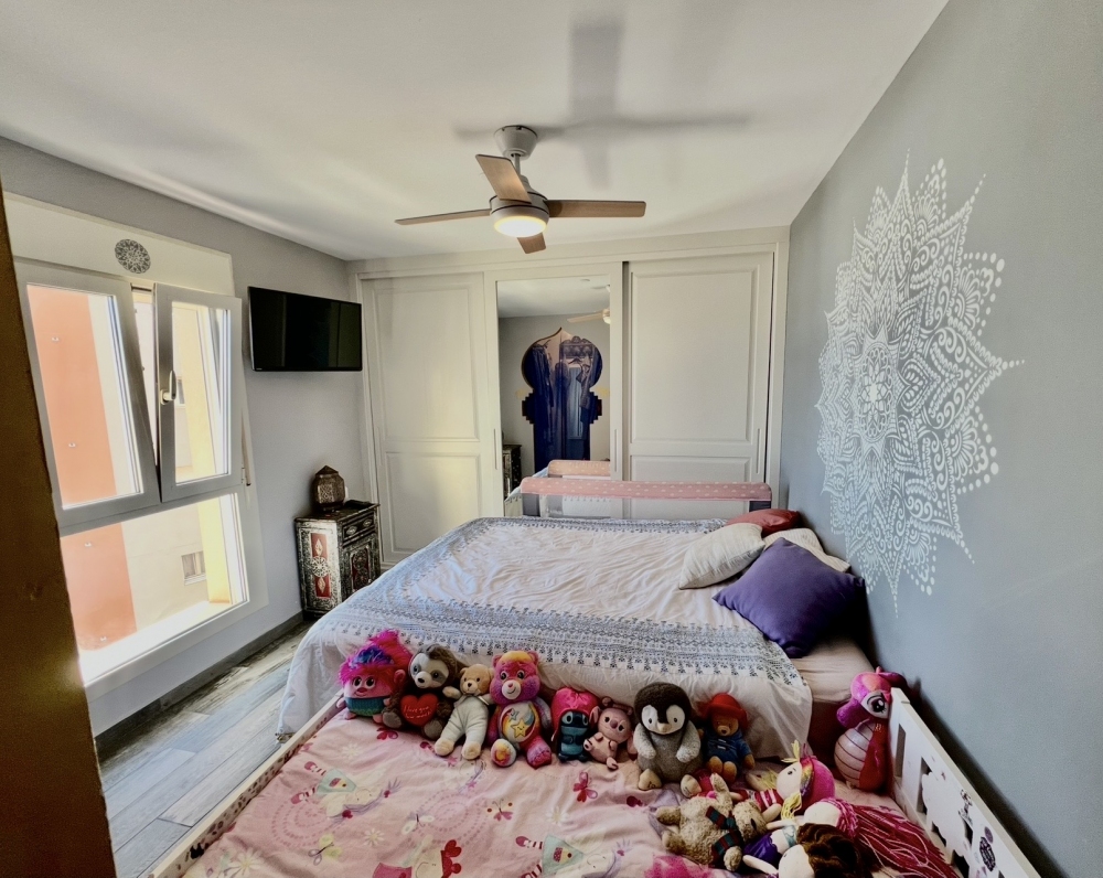 The current layout features the kitchen and main bedroom facing the beautiful sunrise, creating a warm and inviting atmosphere. The master bedroom offers impressive walk-in cupboard space along with fitted wardrobes, providing ample storage. The second bedroom has been beautifully decorated with a Disney-themed design and hand-painted walls, making it a dream space for any child.